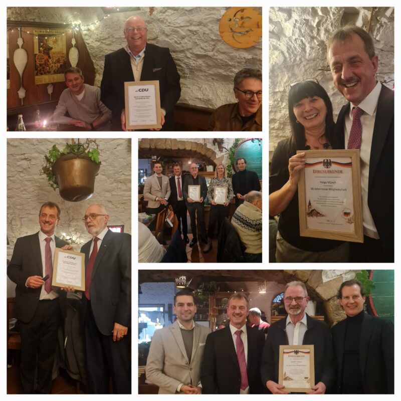 Zum Abschluss des Abends erfolgte dann noch die Ehrung einiger langjähriger Mitglieder. Für 25-jährige Parteimitgliedschaft wurde die bronzene Ehrennadel verliehen an Antonia Meier, Bernhard Wolf und Gerhard Kieser. Für 40-jährige Parteimitgliedschaft erhielt Hugo Woll die silberne Ehrennadel. Und zu guter Letzt wurde die goldene Ehrennadel für 50 Jahre Parteizugehörigkeit übergeben an Winfried Hemberger. Herzlichen Dank für die jahrzehntelange Treue zur Partei – in guten wie in schlechten Zeiten. Auch wenn man in Sachfragen persönlich nicht hinter jeder Position der Partei steht, so eint uns in der Christlich Demokratischen Union doch ein uns allen gemeinsames Wertefundament, das unserem politischen und alltäglichen Handeln zugrunde liegt. In diesem Sinne wünschen wir allen Mitgliedern und allen Mitbürgern nach einer hoffentlich besinnlichen und fröhlichen Weihnachtszeit nun einen guten Start in das neue Jahr 2026!